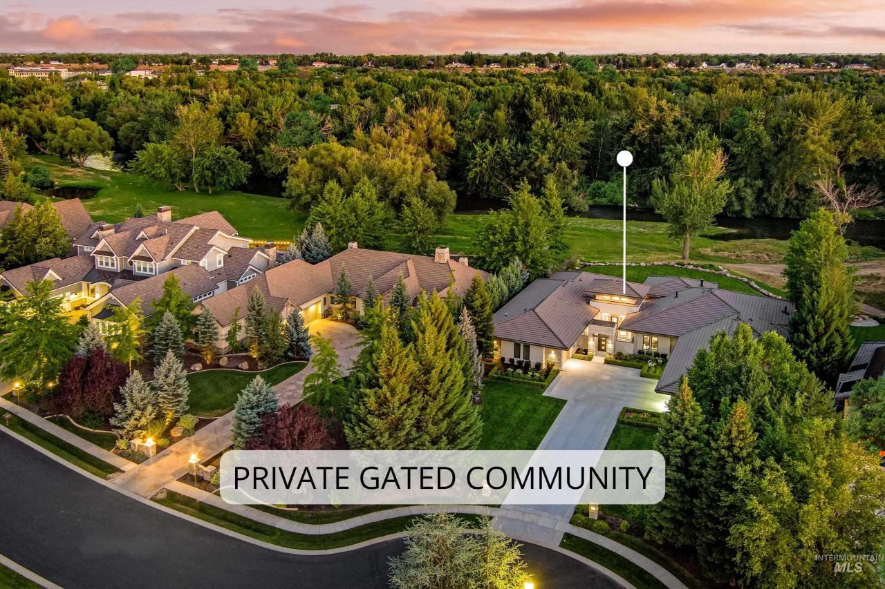 The opportunity to own a private Boise River home in one of Eagles most prestigious gated settings is exceptionally rare. This stunning residence in the Two Rivers neighborhood backs to the River and is protected by forever greenspace, creating a setting defined by serenity and natural beauty. Custom-designed for sophisticated living, the residence makes an immediate statement?clean architectural lines, a balanced façade, and a perfectly manicured landscape leading to a striking entry. Every inch of the property reflects thoughtful design, blending modern finishes with natural textures to create a home that feels both refined and inviting. Step inside to soaring ceilings, sleek tile flooring, and expansive windows that frame breathtaking views of the surrounding landscape. Natural light fills the open living spaces, while the thoughtfully designed layout creates an ideal environment for both relaxed daily living and effortless entertaining. The private primary suite serves as a peaceful retreat, featuring floor-to-ceiling windows and dedicated His & Hers full bathrooms. A beautifully appointed in-law suite/ADU offers a fully self-contained living space complete with a private entrance and attached garage bay - perfect for multi-generational living or hosting long-term guests. Wide hallways, doorways, and a great room anchored by a dramatic rock fireplace with high ceilings.